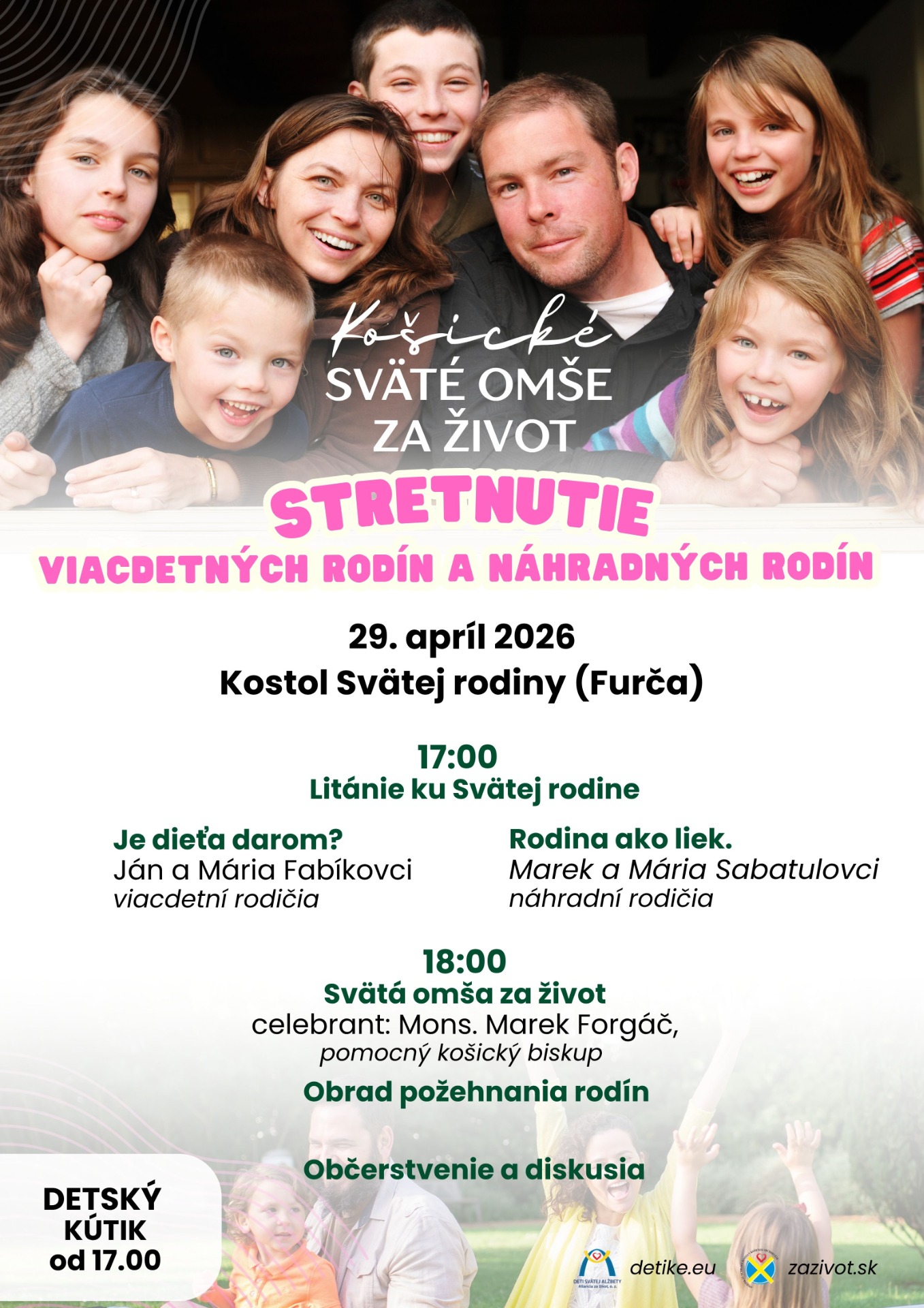 Osobitne pozývame viacdetné rodiny a náhradné rodiny. Potrebujeme ich pokorné svedectvo, aby naša láska dozrievala. Nech neváhajú prísť aj s najmenšími deťmi. Od začiatku stretnutia bude v spoločenskej miestnosti pripravený detský kútik.A rodiny sa iste veľmi potešia aj vašej prítomnosti. "Každá rodina je bunkou spoločnosti, no viacdetná rodina je bunkou, ktorá je bohatšia, vitálnejšia, a je vo výsostnom záujme štátu do nej investovať!" Sv. Otec František